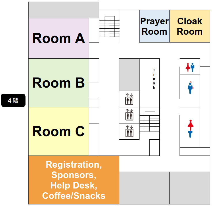 The 4th Floor is where you'll find free coffee and snacks, the help-desk where Moodlers ask and answer each others' burning questions, MAJ sponsors' booths, the main HALL for plenary sessions and the Friday afternoon workshops.