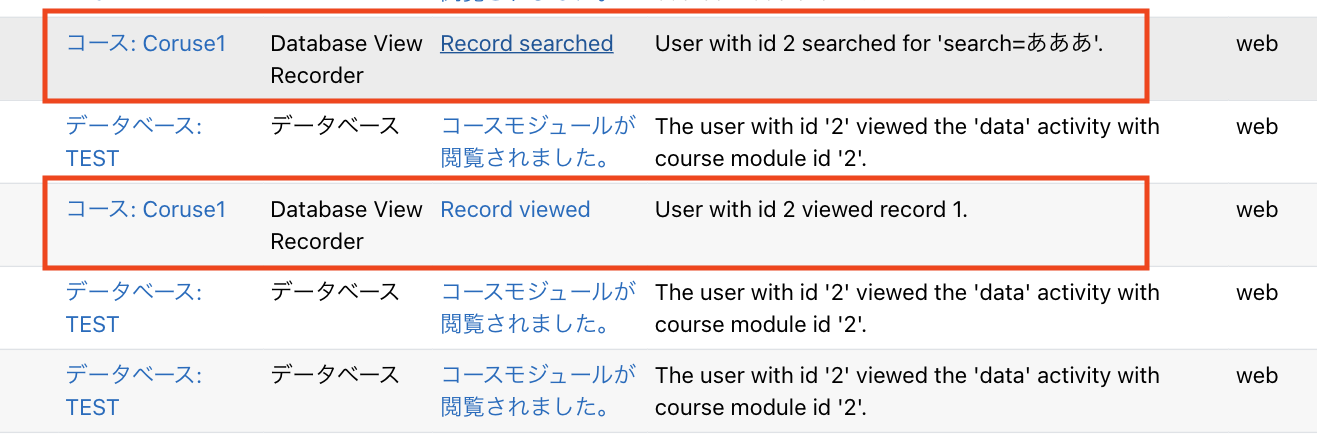 Moodleのデータベースモジュール利用時のログをより詳細に残すためのプラグインです。データベースモジュール利用時、通常は「一覧表示を開く」「個別表示を開く」「検索する」という3つの動作はいずれも「コースモジュールが閲覧されました」のログに統一されてしまっています。