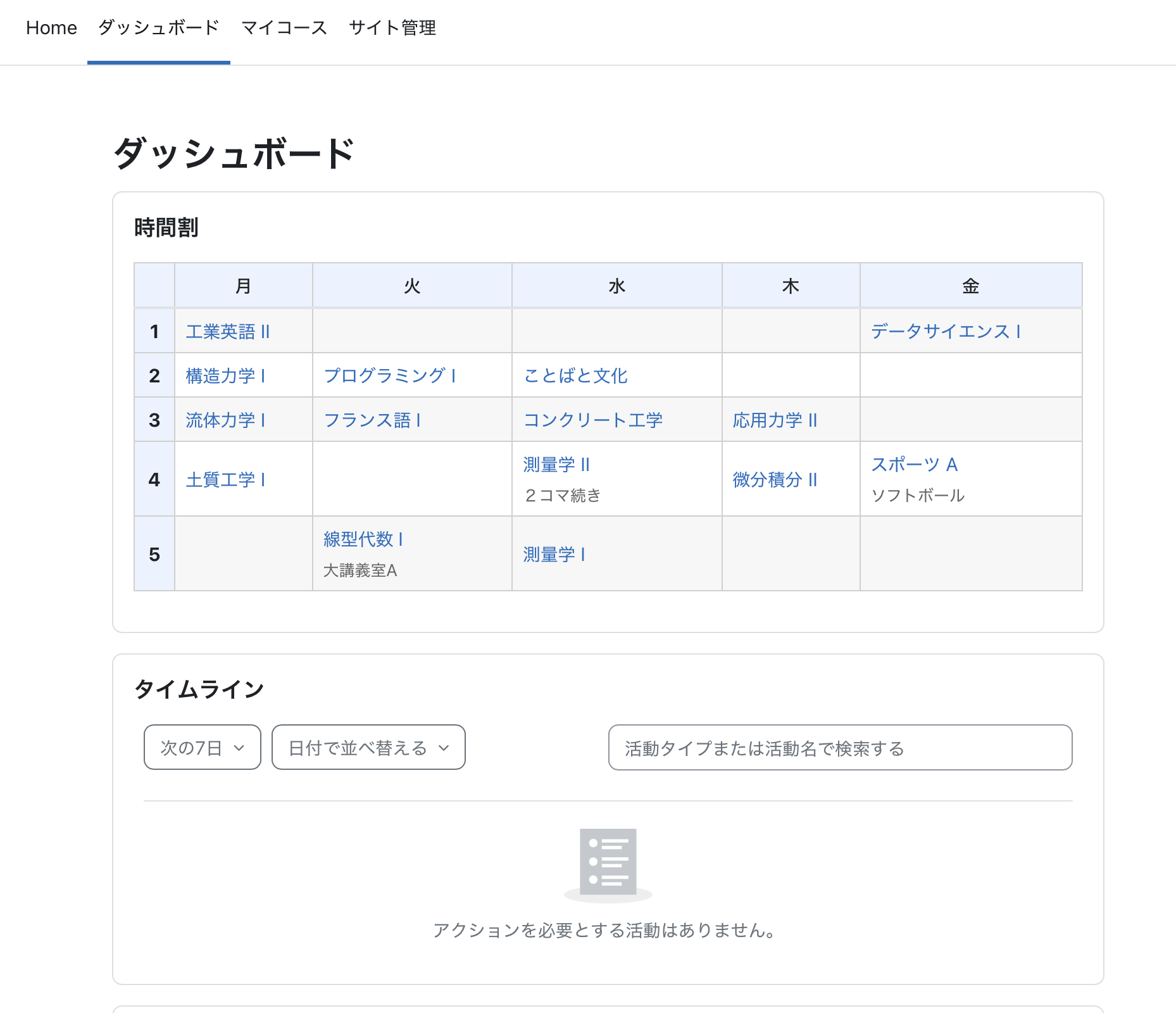 Moodleも進化してマイコースが少しずつ便利にはなってきましたが、やはり親しみ深い時間割形式が好まれるのではないかと思って作成しました。登録情報から自動で作成されるのではなく、ダッシュボード上でユーザ自身が1つずつコースを登録していく形になります。